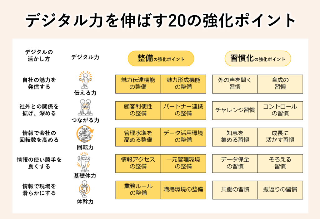 企業内の複数名で「デジトレ診断」を実施して、デジタル活用のきっかけを作ろう お知らせ 2022.10.09 デジトレ診断結果を比較してデジタル化の議論をスタート デジトレ診断の有効な使い方の1つとして、 支援先企業内の複数名の方に実施いただき、デジタル活用の出発点とする方法があります。複数の診断結果を比較することで、各担当の抱えている課題やデジタル活用状況が明らかになり、改善が必要な箇所や各担当者間でより詳細な検討が必要な論点が見えてきます。 社内のデジタル活用をスタートしようとすると、どこから手をつけてたら良いのか、誰に何を担当してもらうか、など具体的にどう進めるかは、迷われるポイントです。複数の方のデジトレ診断結果をきかっけに社内のデジタル活用の議論をスタートさせることは論点も明確になり、非常に効果的です。 今回、デジトレ診断データボードβ(以下、データボードβ)に回答者別のスコアを確認できる新しいページを追加しました。支援先企業内の複数名でデジトレ診断を実施した場合に、結果をわかりやすく可視化できるようになります。 今回は、新しいページの説明と、その活用方法を紹介します。 デジトレ診断の設問は、回答者によって「よく当てはまる」「やや当てはまる」「当てはまらない」の選択にバラツキがでることがあります。同じ会社でも6割位できていれば「よく当てはまる」を選ぶ方もいれば、「やや当てはまる」を選ぶ『慎重派』の方もいます。そのため、『慎重派』の場合「5つの力」、「20の強化ポイント」の点数は全体的に低い傾向があり、そうでない場合の点数は。全体的に高めに出ます。 データボードβでは企業単位でスコアを平均してしまうため、回答者間の認識の相違や課題の捉え方の違いが見えないといった課題がありました。 そこで、同じ回答者の中で「高い点数」と「低い点数」を可視化できれば、どこに課題がある(と回答者が考えている)かを発見しやすくなると考え、今回データボードβに「回答者別20の強化ポイントのスコア」を追加しました。 回答者別の20の強化ポイントを可視化 データボードβの追加されたページを見てましょう。画面左側のページメニューから「回答者別スコア」を選びます。 縦軸に回答者名、横軸に20の強化ポイントを並べたヒートマップが表示されます。 表全体の中で、点数の高い数値は背景が「濃い青」に、低い数値は「薄い青」に表示されます。1名の回答者が複数回の診断をした場合は、平均点が表示されます。また、表のデータは診断実施日の期間、会社名、回答者名、登録日時でフィルタをかけることが可能です。 回答者別20の強化ポイントスコアの活用方法 データボードβのページのヒートマップでは、表全体の中の点数の高低はわかるのですが、回答者ごとの「高い・低い」強化ポイントが色で表現されていません。そこで、回答者ごとの高いポイント・低いポイントをExcelを使って可視化できるテンプレートを用意しました。 Excelをダウンロードして、テンプレートを使って可視化してましょう。まずは、データボードβの表の右上のメニューから、エクスポートを選択します。(表にカーソルを合わせると、表の右上にメニューボタンが表示されます) データのエクスポートのポップアップから、「csv(Excel)」を選択して、エクスポートします。 デジトレ会員サイトから「回答者別20の強化ポイント見える化テンプレート」を入手(支援者プランご契約の方のみ入手可能です)して、データボードβからダウンロードしたExcelのデータを貼り付けます。 Excelのヒートマップには回答者別に20の強化ポイントの点数の高低が表示されます。 Excelのヒートマップは、点数が高いほど「濃い青」に、低いほど「濃い赤」になります。 表を回答者別(横方向)に見てみると、赤い箇所は、その回答者が「出来てない(と考えている)箇所」で、問題箇所と言って良いでしょう。 一方、表を強化ポイント別(縦方向)に見てみると、青系の列、赤系の列、青と赤の混在している列があります。 青が多い強化ポイント(上図の例では「業務ルールの整備」)は比較的、みんなが出来ていると考えている強化ポイントであり、問題ないと言えます。逆に赤が多い場合(上図の例では「外の声を聞く習慣」)は、全員が問題と捉えている強化ポイントであり、何らかの対応が求められると思います。 さらに、青と赤が混在している強化ポイント(上図の例では「共働の習慣」「情報アクセスの整備」)は、回答者によって捉え方が異なっているということです。今後、詳細なヒアリングや回答者間で討論する場を設けるなど、より深掘りが必要になる論点と言えます。 このように、1つの企業内で複数名の方にデジトレ診断を実施いただき、その回答結果から、デジタル活用の論点を炙り出すことができます。社内での議論を深め、デジタル活用の取り組みにつなげてみていかがでしょうか? 今後もデジトレ診断やデータボ