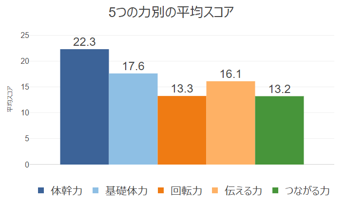 デジトレ診断データを使った分析 お知らせ 2021.06.07 デジトレ診断では、100の設問に回答してもらいデジタル活用度を定量的に表示します。これまでデジトレ診断を使っていただいた120件のデータを使って診断結果を集計・分析してみました。 5つの力の合計スコアは200点満点で、平均は82.3点でした。5つの力は、それぞれ40点満点で、平均スコアは「体幹力」が22.3点と1番高く、続いて「基礎体力」の17.2点という結果でした。「体幹力」とはデジタル活用の視点から、現場の方が滑らかに仕事ができることをスコアで表しているわけですが、どの企業でも最初に手を付ける取り組みということが、1番高い平均スコアに現れているのだと思います。また、「基礎体力」も同様に、どの企業でも情報をうまく使うための工夫や準備に取り組んでいるということなのでしょう。それ以外では、「伝える力」が16.1点と他2つよりも高くなっています。ホームページやSNS活用、インターネット広告など、目的がはっきりしていて、取り組みやすいのかも知れませんし、中小ビジネスでも情報や自社の魅力発信の必要性を感じているからかも知れません。 続いて、従業員の規模別に集計した結果です。こちらは5つの力合計の平均スコアですが、全体の82.3点という結果に対して、1番高かったのは5名以下でした。5名以下の中では「士業・コンサル」が多く、業種・業態の影響もあると思いますが、業務ルールの整備がしやすかったり、小規模でも導入しやすいクラウドサービスなどを活用している結果かも知れません。 デジトレ診断 支援者プランでは、より詳しい分析結果を提供しています。今後もデジトレ診断のデータを使って業種別の傾向やスコアが高い企業の取り組みなど、情報提供していく予定です。