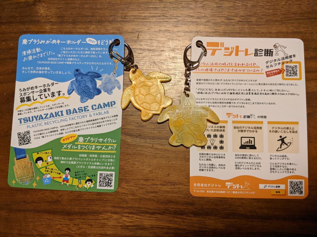 海洋プラゴミを再利用したうみがめキーホルダーが到着! お知らせ 2021.07.27 デジトレでは、クラウドファンディング「CAMPFIRE」のSDGs版である「Good morning」を通じて、「TSUYAZAKI BASE CAMP」が取り組む、海岸清掃活動・環境学習活動を応援しています。 この度、以下の活動のメインスポンサーとして手を挙げさせていただき、そのリターンとして、廃プラうみがめキーホルダーを受け取りました。https://camp-fire.jp/projects/view/389992?fbclid=IwAR2F2dGfZZ9HvHV-kRbjHo7acRlk2Cv2FMtpeLgfT8jSNtO_N4XNzm3fJcc このキーホルダーは、デジトレのノベルティとして、会員様に配布するなど活用してまいります。 TSUYAZAKI BASE CAMPさんの活動 地域の皆さんと一緒に、海岸清掃活動を行い、そこで拾い集めた海洋プラゴミをリサイクルして環境学習活動に展開しています。 海洋プラゴミの分別破砕して資源に変換資源となった海洋プラを溶解して型に流し込んで製品制作 プラの破砕機や溶出する器具も、「ファブラボ」としてオリジナルで製造しており、全国各地で同様のSDGs活動に取り組まれる方に販売・サポートもしています。 Facebookアカウント https://www.facebook.com/283BC公式ホームページ https://283bc.com/ メダルです。子供達って、こういうの喜ぶんですよね。それをごみ収集から破砕、溶出、まで自分達の手で作れるなんてすばらしい体験ですね。 このボールペンも海洋プラゴミを成型して削り出して作ったもの。プレゼントにもよさそう。 地域で頑張る中小ビジネスの一つでもあるTSUYAZAKI BASE CAMPさんですが、同じような取り組みは、地域密着型の他の中小ビジネスさんにも参考になるのではないでしょうか。 海岸がなくたって、プラゴミはいくらでも日常生活であふれています。破砕機や溶出機は販売だけでなくレンタルもされていると聞いています。 うちの地域でもぜひやってみたい。少しでもそう思われたら、TSUYAZAKI BASE CAMPさんに一度コンタクトしてみてください。いろいろ相談に乗ってくれるはずです。