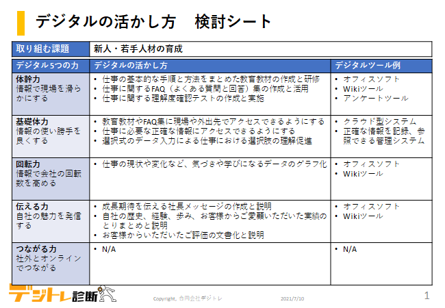 人材育成のためのIT・デジタル活用 お知らせ 2021.07.10 ここのところ、複数の中小ビジネスからのご相談で、たまたまなのか必然なのか、「人材育成」というテーマが相次いで寄せられています。 採用した若手をどう育成したらいいのか営業担当者がなかなか伸びないがITで何かできないか 多くの中小ビジネスで人材育成というのは大きな課題となっています。しかし、IT・デジタルで何ができるのか、というのはなかなかネットを探しても出てこない。いや、正確には、少し大きい組織の人材育成に資するツールは出てくるけど、例えば一人採用した若手を育てたいとか、社内の3人の若手営業を育てたいといった、少ない人数を対象にしたものがなかなか見当たらない。数十万円のソフトを導入するには少しオーバースペックなんですよね。もう少しライトに、手軽に、安価なツールでできることはないのだろうか。。 そこで、デジトレメンバーで執筆した書籍「中小ビジネスを伸ばす デジタル-5つの活かし方(7/16以降お買い求めいただける予定です)」に基づいて、人材育成においてデジタルでできること、を整理してみました。 端的には、マニュアル的なものを作成しましょう、ということですが、少し表現を工夫してみました。 <仕事の基本的な手順と方法をまとめた教育教材>こういうものって通常は「マニュアル」と言ったりしますが、マニュアルっていうと、「はい、それを見てしっかり仕事してね」的なニュアンスも含まれるかなと思いましたので、「教育教材」と書くことで、研修会とかを開催してしっかり伝達する必要性を強調してみました。大切なことは、教育教材を作ることではなくて、作った教育教材で教育を行う、ということですね。 <仕事に関するFAQ(よくある質問と回答)集>デジトレでは、現場で社員が戸惑ったり迷ったりするポイントをクリアするために、FAQをまとめることをオススメしています。よく間違うこととか、よく先輩社員が質問されることなどを一覧にしておき、新人さんにそれを共有し、「説明」しましょう。これも、書いてあるから読んでおいてね、ではダメです。やはり、一つひとつについて言葉で説明することで、背景や経緯、狙いも含めて伝わるものだと思います。 <仕事に関する理解度確認テスト>一度や二度の研修会や説明をすれば、社員がすんなりすべてを理解して腹落ちするかというとそんなことはありません。繰り返しの伝達はやはり不可欠なもの。そんな時に、理解度を測ることができれば、説明する側の説明の仕方のレベルアップができます。理解度が高まらないのは、被教育者の問題ではなく、教育者の問題、教育教材の問題、と考えてカイゼンしていきませんか。 <仕事の現状や変化など、気づきや学びになるデータ>小売店の店頭で、「この商品、売れてます」的なPOPをご覧になったこともあるでしょう。社員だって、自社の商品やサービスの何が人気で売れているのか、お客様に喜ばれているのか、知りたいし、知っていれば一歩踏み込んだ一言や行動につなげることができるかもしれません。 <成長期待を伝える社長メッセージの作成と説明>こういうものも、口頭で伝えるだけではなく、書面で思いをしっかりと伝えられるように表現を徹底的に工夫する、それを手渡しする、そして、それを対面で伝達する。伝えるんだという「迫力」が思いを伝えることを後押ししてくれます。 実際に活用するデジタルツールの例としては定番の「オフィスソフト」が中心になります。オフィスソフトがIT活用・デジタル活用かって? はい、まぎれもなくデジタル活用です。とてもベーシックなツールですが、それを徹底的に、効果的にフル活用していくことは、デジタル活用の第一歩だと考えています。クラウド型のオフィスソフトと言えるのが、GoogleドキュメントやConfluence、JimdoといったWikiツール(書き込みや編集が容易なWebツール)です。これらを利用すると、クラウドシステムですから、社内にいなくても、スマホやタブレット端末で現場や外出時にも確認できるようになります。 また、基幹システムの入力についても、ちょっとしたことですが、選択肢から入力する方式にしておくと教育効果が高まります。選択肢を見るだけで、「ああ、そういう選択肢があるんだ」「次の案件では他の選択肢になるのかもしれない」「他の選択肢のこと、自分はよく理解していないぞ」といった気づきを生み出し、選択肢そのものが教育的情報となります。 こうして整理してみますと、要するには「文書化」してみましょう、という一言に尽きますね。口頭で伝えている、日頃のOJTで口を酸っぱくして伝えていることでも、一旦文書にしてみる。文書にすることで、伝える側も伝え方が洗練されていきます。受け取る側も、フローではなくストックとして情報に触れられることで、繰り返し、反芻して理解を深めることがしやすくなります。 せっかく使いやすいオフィスソフトやWikiツ