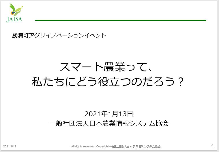 勝浦町アグリイノベーションマッチングイベントでデジトレ診断をご紹介させていただきました。 お知らせ 2021.01.13 「勝浦町の農業にICTやAIでイノベーションを!」をテーマに開催された徳島県勝浦町のスマート農業イベント。JAISA(一般社団法人日本農業情報システム協会)の立場で講演させていただく中で、デジトレ診断も事例とあわせて紹介させていただきました。 ●情報で現場を滑らかにする 圃場管理システム(アグリノート)をカーナビ代わりにしてパートさんが圃場に迷わず行けるようにした千葉県のネギ生産法人 ●情報の使い勝手を良くする 土壌分析の結果をExcelで蓄積して管理、それを圃場でも確認できるように、Dropboxを使っている高知県のキュウリ農家 ●情報で会社の回転数を高める 接客レベルを高めるために、観光農園のお客様データをデータベースにした千葉県のブルーベリー観光農園 ●自社の魅力を伝達する 毎日SNSで写真・動画など趣向を変えて発信している北海道のメロン農家 ●社外との関係を拡げ、深める 飲食店から有機野菜の注文をクラウドの発注管理システムで受け取っている茨城県の有機野菜農家