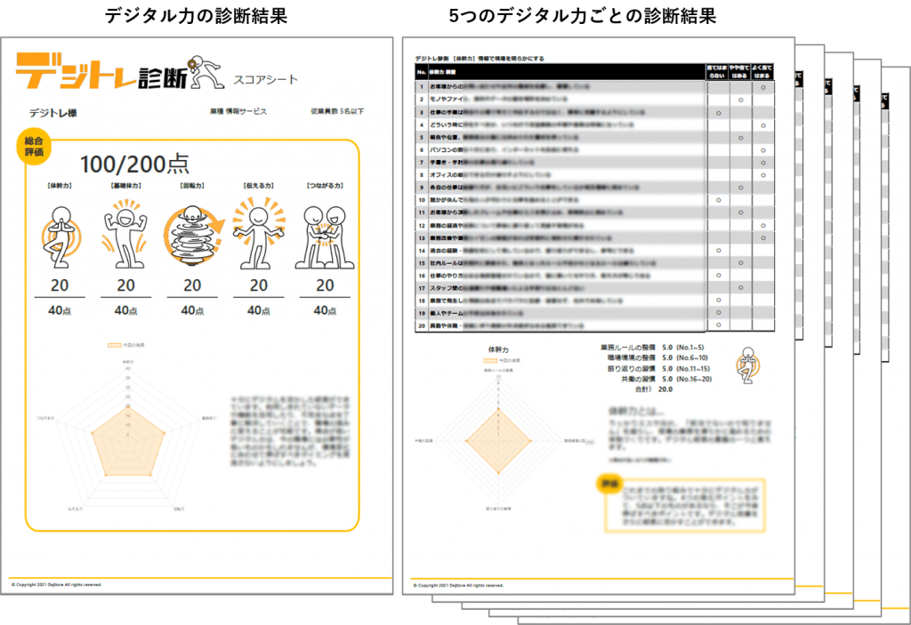 デジトレ診断のスコアシートが新フォーマットになりました。 お知らせ 2021.02.26 デジトレ診断のスコアシートが新フォーマットとなりました。中小ビジネスのデジタル経営に必要な5つのデジタル力を可視化することができます。 ■総合評価 5つのデジタル力の合計点、バラツキを確認できます。 ■5つのデジタル力ごとの診断結果 5つのデジタル力ごとに、設問への回答結果と点数を確認できます。 次に行うべきアクションの判断にお役立てください。