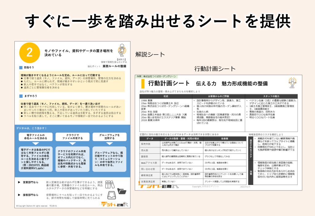 デジトレ診断のご紹介資料をUpdateしました お知らせ 2022.09.09 わたしたちデジトレのミッションは「地域で頑張る中小ビジネスのデジタル経営現場の知恵と工夫に学び、整理・体系化して再び現場に届けること。」です。 現場で学ぶことは本当に多くあり、デジトレ診断についても、活用の仕方や有効性を表現する言葉の選択なども、利用者様から教えていただくこと、気づかされることがあります。 デジトレ診断のご紹介資料も、そういった視点を都度反映してきていますが、この9月にも次のような改版をさせていただきました。 「組織のデジタル力を定量化する」という言葉を新たに選択しました。最近はDX診断ツールが様々登場しています。これはよいこと、中小ビジネスにとっての選択肢が増えるのは健全なこととわたしたちはとらえていますが、同時に、診断ツールの選択に迷われてしまうようであれば本末転倒。デジトレ診断の特徴をより明確にお伝えできる言葉を選択することが大切、そう考えました。「デジタル力=デジタルを活かす組織能力」と定義し、それを定量的に可視化するのがデジトレ診断、そういう説明の仕方を選択しています。設問について、より明確に「ベストプラクティス」と説明します。デジトレ診断の設問は、中小ビジネスの多くの事例に共通する模範的取り組みを100抽出し、設問化したもの。これをしっかりとお伝えするのも価値をご理解いただくために必要と考えます。そこで、「ベストプラクティス」という説明をより明確に記載しました。「ありたい姿整理シート」の位置づけも明確にすでに、デジトレ診断Quickでは、ご利用になる前に、「ありたい姿整理シート」で経営の方向感を整理してからお取組みください、とご案内しています。漠然と、問題意識や、方向感がないままにデジトレ診断をしても、自社が取り組みたいテーマは見つかりにくいことがわかっています。やはり、夢を持って、意欲を持って自己診断することで、効果的なアクションが見つかるので、そういった点で、「ありたい姿整理シート」はデジトレ診断と一心同体の必要不可欠なシートとして明確に位置付けました。「中小ビジネスのDX=カイゼン×デジタル」思い切って定義してみました。中小事業者や農業経営者にとってのDXって何だろう、大手企業のDXとはまた視点・位置づけが違うな、と感じながら歩んでくるなかで、やはり「カイゼン」という言葉は重要であると再認識しました。「カイゼンをいくら積み重ねても変革にはつながらない」そういう論もあることは理解しています。が、実際の中小ビジネスの現場では、まずやるべきはカイゼンであるし、それは取り組みやすい第一歩になる、そこにデジタルを取り入れてみる、これがDXへの第一歩となる、そう考えています。カイゼンも、徹底的に高みを目指せば、半自動・全自動・アウトソーシングと業態や事業の在り方の変化にだってつながるわけで、「変革」というとらえにくいマジックワードを使うよりは、使い古された(と思い込んでいる)「カイゼン」という言葉にあらためてフォーカスし、そういった取り組みを積み重ねる先に事業変革あるいはトランスフォーメーションにつながるアプローチが待っている、という点をお伝えしたいと考えています。 ぜひご覧いただければ幸いです。なお、支援者プランご契約の皆様は、パワーポイントファイルでダウンロード可能になっていますので、ご自身のプレゼン資料と組み合わせてご利用いただくことが可能です。