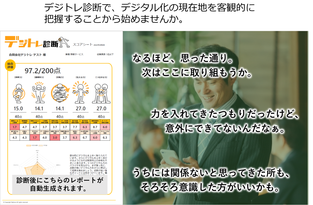 中小企業や農業経営体のDXを加速する無料のオンライン⾃⼰診断ツール「デジトレ診断Quick」を提供開始 お知らせ 2022.08.03 すでに1,000社以上の中⼩企業や農業経営体が利⽤している「デジトレ診断」の無料版をリリース 中⼩ビジネスのためのデジタル経営の⾃主トレ⽀援サイト「デジトレ」を運営する合同会社デジトレ(東京都中央区)は、すでに1,000社以上の中⼩企業や農業経営体が利⽤している、⾃社のデジタル活⽤度をセルフチェックしてDX・デジタル活⽤の次の⼀⼿を⾒つけるためのオンライン⾃⼰診断ツール「デジトレ診断」の無料版として、「デジトレ診断Quick」の提供を2022年8⽉より開始いたします。 合同会社デジトレが提供するオンライン⾃⼰診断ツール「デジトレ診断」は、⾃社のデジタル活⽤の現状を俯瞰でき、デジタルをどこまで活かせているのか、強いところ、⾜りないところが⼀⽬でわかる⾃⼰診断ツールです。 100問からなる設問は、中⼩企業や農業経営体の実際のデジタル活⽤事例から抽出したベストプラクティス集となっており、設問に回答しながら模範とすべきデジタル活⽤の取り組みや視点を学び取り、⾃社に必要な次の⼀⼿を⾒つけることができます。 2020年に有料版として提供を開始して以来、主にITコーディネータや商⼯会議所などの中⼩ビジネスの⽀援者を通じて、DXセミナーや研修会、個別相談の場で、1,000社を超える事業者にデジトレ診断を活⽤いただいています。 この度、設問数を従来の半分の50問に厳選した「デジトレ診断Quick」をあらたに開発し、これを無料で⾃⼰診断に利⽤できるようにしました。 これにより、さらに多くの中⼩企業や農業経営体の⼿にデジトレ診断を届け、⾃ら⼿軽に短時間で⾃社に必要な⼀⼿を⾒つけていただくことで、それぞれの事業者が、⾃社にあった、事業の成⻑に直結するDX・デジタル活⽤の取り組みを加速できる環境を整えます。 <商品・サービス概要>デジトレ診断は、⾃社のデジタル活⽤の現状を俯瞰でき、デジタルをどこまで活かせているのか、強いところ、⾜りないところが⼀⽬でわかる⾃⼰診断ツールです。 【1】職場のデジタル活⽤度を把握する デジトレ診断は、職場のデジタル活⽤度を独⾃の指標である「5つのデジタル⼒」と「20の強化ポイント」で定量化します。情報システムなどデジタルツールの環境整備の状況と、システムやデータを活かすための組織としての習慣化の現状を、客観的指標で把握できます。 【2】ベストプラクティスから学ぶデジトレ診断の設問は、中⼩企業や農業経営体の実際のデジタル活⽤事例から抽出したベストプラクティス集です。先進的な中⼩ビジネスはどのようなデジタル活⽤に取り組んでいるのか、どういった視点を持つ必要があるのか、⾃社で出来ていないのはどんな点か。設問に回答しながら模範とすべきデジタル活⽤の取り組みや視点を学び取ることができます。 【3】あなたの職場に必要な⼀⼿を選ぶ 現状を把握し、ベストプラクティスを学んだら、あなたの職場に必要な次の⼀⼿を⾃ら選択して実⾏しましょう。これからの事業に必要な取り組みは何ですか?⾜りないものは何ですか?あれもこれも選ぶ必要はありません。実⾏できなければ絵に描いた餅です。ベストプラクティスの中から、あなたの職場で伸ばしたいものを1つ選び、それを着実に実⾏しましょう。あなたの⼀歩を後押しするワークシートも提供します。 わずか10分でこれらをセルフチェックできるのがデジトレ診断です。 ⽐較項⽬デジトレ診断デジトレ診断Quickサービス開始2020年12⽉〜2022年8⽉〜設問数100問50問アクセス⽅法WebブラウザでアクセスWebブラウザでアクセススコア化の⽅法独⾃指標である「5つのデジタル⼒」と「20の強化ポイント」で定量化独⾃指標である「5つのデジタル⼒」と「20の強化ポイント」で定量化⽣成されるレポート1)スコアシート2)解説シート+⾏動計画シート3)補⾜説明資料1)スコアシート2)解説シート+⾏動計画シート3)補⾜説明資料価格⽀援者プラン 18,000円/年〜無料主な利⽤条件他社の診断に利⽤可能⾃社の⾃⼰診断に利⽤可能