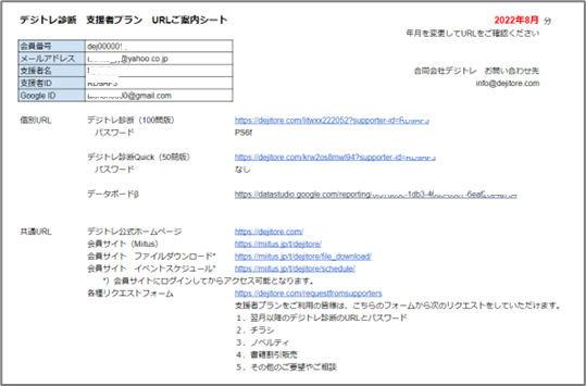 支援者プランにて「URLご案内シート」の提供を開始 お知らせ 2022.08.31 この度、支援者プランのご契約者様を対象に「URLご案内シート」の提供を開始しました。 この「URLご案内シート」は、デジトレ診断に関連する複数のURLをわかりやすく一覧にしてご案内するものです。 デジトレ診断(100問版)支援者ID付きURL、パスワード ←毎月自動更新されますデジトレ診断Quick(50問版)支援者ID付きURLデータボードβ URLデジトレ公式ホームページURL会員サイト(MiiT+)URL会員サイト ファイルダウンロード URL会員サイト イベントスケジュール URL各種リクエストフォーム URL翌月以降のデジトレ診断のURLとパスワードチラシ・ノベルティ書籍割引販売その他 ※Google ID宛に共有設定のご連絡をさせていただいております。 この「URLご案内シート」のURLのみブックマークしておいていただければ、毎月、デジトレ診断のURLやQuickのURL、データボードのURLなど、すぐにご確認いただくことができます。ぜひ上手くご活用いただければと思います。