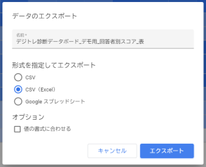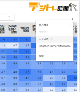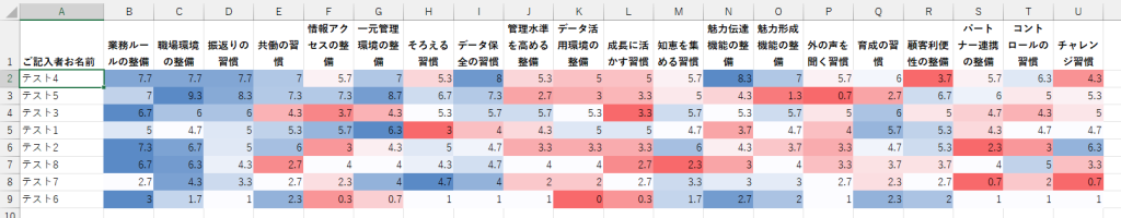 企業内の複数名で「デジトレ診断」を実施して、デジタル活用のきっかけを作ろう お知らせ 2022.10.09 デジトレ診断結果を比較してデジタル化の議論をスタート デジトレ診断の有効な使い方の1つとして、 支援先企業内の複数名の方に実施いただき、デジタル活用の出発点とする方法があります。複数の診断結果を比較することで、各担当の抱えている課題やデジタル活用状況が明らかになり、改善が必要な箇所や各担当者間でより詳細な検討が必要な論点が見えてきます。 社内のデジタル活用をスタートしようとすると、どこから手をつけてたら良いのか、誰に何を担当してもらうか、など具体的にどう進めるかは、迷われるポイントです。複数の方のデジトレ診断結果をきかっけに社内のデジタル活用の議論をスタートさせることは論点も明確になり、非常に効果的です。 今回、デジトレ診断データボードβ(以下、データボードβ)に回答者別のスコアを確認できる新しいページを追加しました。支援先企業内の複数名でデジトレ診断を実施した場合に、結果をわかりやすく可視化できるようになります。 今回は、新しいページの説明と、その活用方法を紹介します。 デジトレ診断の設問は、回答者によって「よく当てはまる」「やや当てはまる」「当てはまらない」の選択にバラツキがでることがあります。同じ会社でも6割位できていれば「よく当てはまる」を選ぶ方もいれば、「やや当てはまる」を選ぶ『慎重派』の方もいます。そのため、『慎重派』の場合「5つの力」、「20の強化ポイント」の点数は全体的に低い傾向があり、そうでない場合の点数は。全体的に高めに出ます。 データボードβでは企業単位でスコアを平均してしまうため、回答者間の認識の相違や課題の捉え方の違いが見えないといった課題がありました。 そこで、同じ回答者の中で「高い点数」と「低い点数」を可視化できれば、どこに課題がある(と回答者が考えている)かを発見しやすくなると考え、今回データボードβに「回答者別20の強化ポイントのスコア」を追加しました。 回答者別の20の強化ポイントを可視化 データボードβの追加されたページを見てましょう。画面左側のページメニューから「回答者別スコア」を選びます。 縦軸に回答者名、横軸に20の強化ポイントを並べたヒートマップが表示されます。 表全体の中で、点数の高い数値は背景が「濃い青」に、低い数値は「薄い青」に表示されます。1名の回答者が複数回の診断をした場合は、平均点が表示されます。また、表のデータは診断実施日の期間、会社名、回答者名、登録日時でフィルタをかけることが可能です。 回答者別20の強化ポイントスコアの活用方法 データボードβのページのヒートマップでは、表全体の中の点数の高低はわかるのですが、回答者ごとの「高い・低い」強化ポイントが色で表現されていません。そこで、回答者ごとの高いポイント・低いポイントをExcelを使って可視化できるテンプレートを用意しました。 Excelをダウンロードして、テンプレートを使って可視化してましょう。まずは、データボードβの表の右上のメニューから、エクスポートを選択します。(表にカーソルを合わせると、表の右上にメニューボタンが表示されます) データのエクスポートのポップアップから、「csv(Excel)」を選択して、エクスポートします。 デジトレ会員サイトから「回答者別20の強化ポイント見える化テンプレート」を入手(支援者プランご契約の方のみ入手可能です)して、データボードβからダウンロードしたExcelのデータを貼り付けます。 Excelのヒートマップには回答者別に20の強化ポイントの点数の高低が表示されます。 Excelのヒートマップは、点数が高いほど「濃い青」に、低いほど「濃い赤」になります。 表を回答者別(横方向)に見てみると、赤い箇所は、その回答者が「出来てない(と考えている)箇所」で、問題箇所と言って良いでしょう。 一方、表を強化ポイント別(縦方向)に見てみると、青系の列、赤系の列、青と赤の混在している列があります。 青が多い強化ポイント(上図の例では「業務ルールの整備」)は比較的、みんなが出来ていると考えている強化ポイントであり、問題ないと言えます。逆に赤が多い場合(上図の例では「外の声を聞く習慣」)は、全員が問題と捉えている強化ポイントであり、何らかの対応が求められると思います。 さらに、青と赤が混在している強化ポイント(上図の例では「共働の習慣」「情報アクセスの整備」)は、回答者によって捉え方が異なっているということです。今後、詳細なヒアリングや回答者間で討論する場を設けるなど、より深掘りが必要になる論点と言えます。 このように、1つの企業内で複数名の方にデジトレ診断を実施いただき、その回答結果から、デジタル活用の論点を炙り出すことができます。社内での議論を深め、デジタル活用の取り組みにつなげてみていかがでしょうか? 今後もデジトレ診断やデータボ
